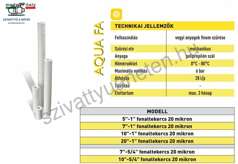 Az Aqua FA 5-1 coll fonaltekercses szűrőbetétet vegyi anyagok finom szűrésére, mechanikus lebegő szennyeződések szűrésére javasoljuk. Vasas víz, homoskos víz szűrésére. A szűrőbetét magassága 125 mm.