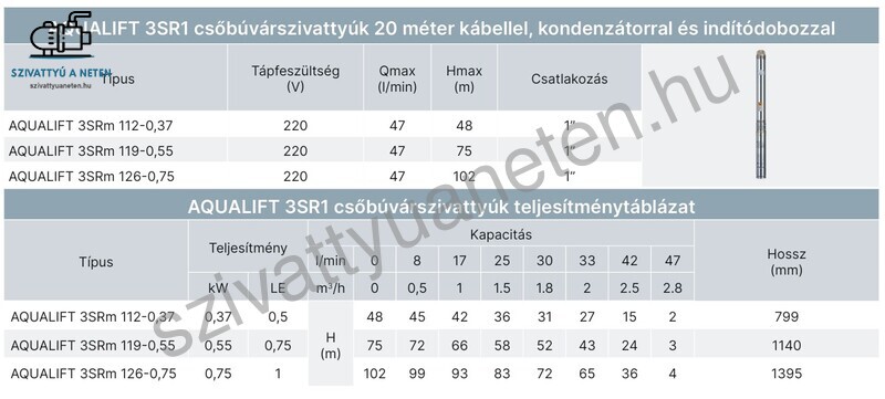 Az Aqualift 3SRm 112-0,37 három colos búvárszivattyú ideális a ház körüli öntözési feladatok ellátására, de természetesen hidrofortartállyal és nyomáskapcsolóval kiegészítve a házban lévő vízellátást is képes biztosítani, a kút paramétereinek figyelembevételével. Maximális vízbemeríthetősége 20 méter, azaz a vízszint alá maximum 20 méterig engedhető. Elsősorban tiszta víz szivattyúzására alkalmas, maximális homoktartalom 50 g/m3. Olcsó, de megbízható három colos Aqualift búvárszivattyú csőkút szivattyú szakkereskedőtől, biztos kézből.