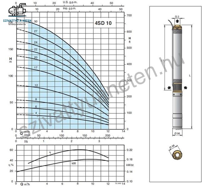 A Calpeda 4SD 10/12EC búvárszivattyú gyártása során minden felhasznált alapanyag csak és kizárólag kiváló minőségű lehet, ez alapelv. Ennek köszönhetően a szivattyú hidraulika akár 300 g/m3 homoktűrő képességgel is rendelkezhet. A Calpeda 4 colos csőkút szivattyúkat előszeretettel használják lakóházak vízellátására, mezőgazdaságban gyümölcs és zöldség öntözéshez. A nagyobb emelőmagasságú és vízhozamú Calpeda 4SD szivattyúkat iparterületek vízellátására, tüzi víztározók biztonsági szivattyújának, de akár hidroglóbusz feltöltésére is alkalmasak. Mégis jellemzően fúrt kutakban alkalmazzák leggyakrabban. A minimum kútátmérő 110 mm. Nagyobb , hosszabb típusoknál fontos, hogy a kút egyenes legyen, és a perforációk ne akadályozzák a lehelyezést. Ebben az esetben inkább legyen 125 mm-es a kút átmérő. A Calpeda 4SD 10/12EC búvárszivattyú motorja nem rendelkezik termikus hővédelemmel, ezért a biztonságos üzemeltetés érdekében érdemes megfelelő motorvédelemről gondoskodni. Erről ügyfélszolgálatunkon keresztül kaphat megfelelő segítséget.