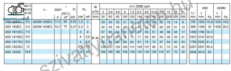 A Calpeda 4SD 15/9EC búvárszivattyú gyártása során minden felhasznált alapanyag csak és kizárólag kiváló minőségű lehet, ez alapelv. Ennek köszönhetően a szivattyú hidraulika akár 300 g/m3 homoktűrő képességgel is rendelkezhet. A Calpeda 4 colos csőkút szivattyúkat előszeretettel használják lakóházak vízellátására, mezőgazdaságban gyümölcs és zöldség öntözéshez. A nagyobb emelőmagasságú és vízhozamú Calpeda 4SD szivattyúkat iparterületek vízellátására, tüzi víztározók biztonsági szivattyújának, de akár hidroglóbusz feltöltésére is alkalmasak. Mégis jellemzően fúrt kutakban alkalmazzák leggyakrabban. A minimum kútátmérő 110 mm. Nagyobb , hosszabb típusoknál fontos, hogy a kút egyenes legyen, és a perforációk ne akadályozzák a lehelyezést. Ebben az esetben inkább legyen 125 mm-es a kút átmérő. A Calpeda 4SD 15/9EC búvárszivattyú motorja nem rendelkezik termikus hővédelemmel, ezért a biztonságos üzemeltetés érdekében érdemes megfelelő motorvédelemről gondoskodni. Erről ügyfélszolgálatunkon keresztül kaphat megfelelő segítséget.