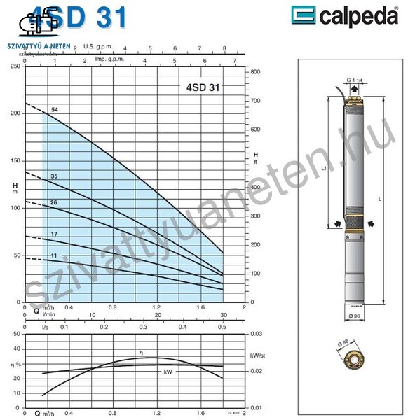 A Calpeda 4SD 31/54EC búvárszivattyú gyártása során minden felhasznált alapanyag csak és kizárólag kiváló minőségű lehet, ez alapelv. Ennek köszönhetően a szivattyú hidraulika akár 300 g/m3 homoktűrő képességgel is rendelkezhet. A Calpeda 4 colos csőkút szivattyúkat előszeretettel használják lakóházak vízellátására, mezőgazdaságban gyümölcs és zöldség öntözéshez. A nagyobb emelőmagasságú és vízhozamú Calpeda 4SD szivattyúkat iparterületek vízellátására, tüzi víztározók biztonsági szivattyújának, de akár hidroglóbusz feltöltésére is alkalmasak. Mégis jellemzően fúrt kutakban alkalmazzák leggyakrabban. A minimum kútátmérő 110 mm. Nagyobb , hosszabb típusoknál fontos, hogy a kút egyenes legyen, és a perforációk ne akadályozzák a lehelyezést. Ebben az esetben inkább legyen 125 mm-es a kút átmérő. A Calpeda 4SD 31/54EC búvárszivattyú motorja nem rendelkezik termikus hővédelemmel, ezért a biztonságos üzemeltetés érdekében érdemes megfelelő motorvédelemről gondoskodni. Erről ügyfélszolgálatunkon keresztül kaphat megfelelő segítséget.