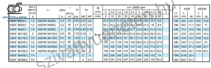 A Calpeda 4SDFM 36/6EC búvárszivattyú gyártása során minden felhasznált alapanyag csak és kizárólag kiváló minőségű lehet, ez alapelv. Ennek köszönhetően a szivattyú hidraulika akár 300 g/m3 homoktűrő képességgel is rendelkezhet. A Calpeda 4 colos csőkút szivattyúkat előszeretettel használják lakóházak vízellátására, mezőgazdaságban gyümölcs és zöldség öntözéshez. A nagyobb emelőmagasságú és vízhozamú Calpeda 4SD szivattyúkat iparterületek vízellátására, tüzi víztározók biztonsági szivattyújának, de akár hidroglóbusz feltöltésére is alkalmasak. Mégis jellemzően fúrt kutakban alkalmazzák leggyakrabban. A minimum kútátmérő 110 mm. Nagyobb , hosszabb típusoknál fontos, hogy a kút egyenes legyen, és a perforációk ne akadályozzák a lehelyezést. Ebben az esetben inkább legyen 125 mm-es a kút átmérő. A Calpeda 4SDFM 36/6EC búvárszivattyú külsőindítókondenzátoros modell. A működtetéshez indítódoboz szükséges. Az indítódoboz választékunkat a szivattyú vezérlés, indítódoboz menüpont alatt találja, ahol motorteljesítmény alapján választhat megfelelő indítódobozt.