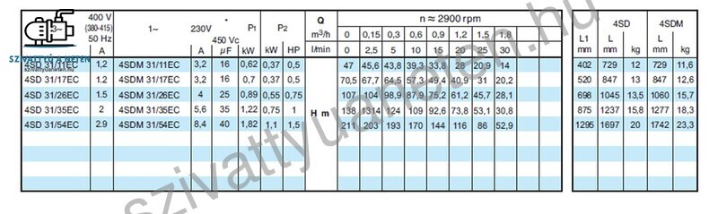 A Calpeda 4SDM 31/11EC búvárszivattyú gyártása során minden felhasznált alapanyag csak és kizárólag kiváló minőségű lehet, ez alapelv. Ennek köszönhetően a szivattyú hidraulika akár 300 g/m3 homoktűrő képességgel is rendelkezhet. A Calpeda 4 colos csőkút szivattyúkat előszeretettel használják lakóházak vízellátására, mezőgazdaságban gyümölcs és zöldség öntözéshez. A nagyobb emelőmagasságú és vízhozamú Calpeda 4SD szivattyúkat iparterületek vízellátására, tüzi víztározók biztonsági szivattyújának, de akár hidroglóbusz feltöltésére is alkalmasak. Mégis jellemzően fúrt kutakban alkalmazzák leggyakrabban. A minimum kútátmérő 110 mm. Nagyobb , hosszabb típusoknál fontos, hogy a kút egyenes legyen, és a perforációk ne akadályozzák a lehelyezést. Ebben az esetben inkább legyen 125 mm-es a kút átmérő. A Calpeda 4SDM 31/11EC búvárszivattyú külsőindítókondenzátoros modell. A működtetéshez indítódoboz szükséges. Az indítódoboz választékunkat a szivattyú vezérlés, indítódoboz menüpont alatt találja, ahol motorteljesítmény alapján választhat megfelelő indítódobozt.