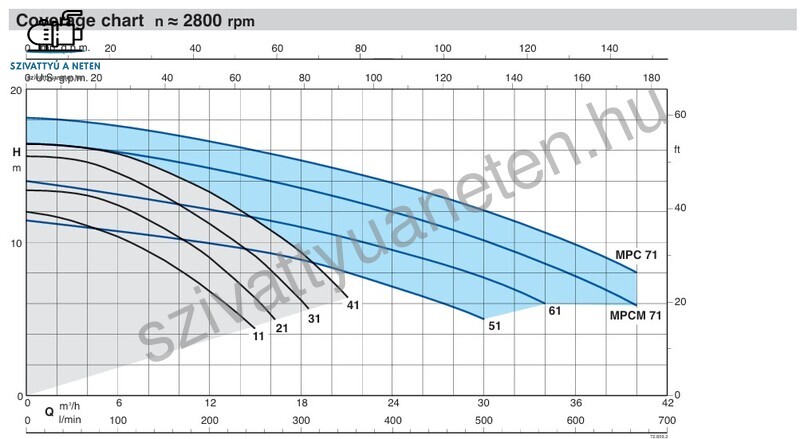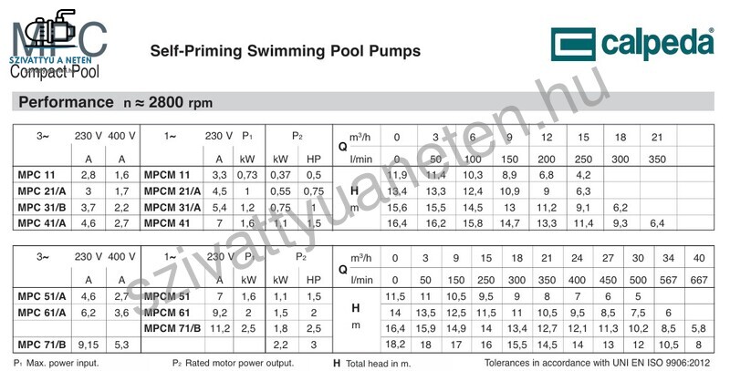 ellenáll a korróziónak és a homok eróziónak. Diffurzor fedél thermoplasticból, a járókerék PRO-GF30 norylból. Az előszűrő fedele átlátszó polikarbonát LEXAN. Az előszűrőben található szűrőkosár anyaga polipropilén. A Calpeda MPC 51 motorja háromfázisú 400V-os réztekercselésű, F szigeteléssel és IPX4 védettséggel rendelkezik. A motor tér védelmét vízbehatolás ellen kiváló minőségű szén-kerámia FPM tengelytömítés biztosítja. Ez a medence szivattyú maximum + 60 fokos vízhőmérsékletig használható. A Calpeda MPC 51 szívóoldali csatlakozása 2 coll belsőmenet, a nyomóoldali csatlakozása pedig szintén 2 coll belső menet. Mindkét csatlakozás AISI 304 rozsdamentes acélgyűrűvel erősítve. A szivattyú motortengelye tartós, erős AISI 303 rozsdamentes acélból. Megfelelő motorvédelemről a biztonságos üzemeltetés érdekében gondoskodni kell!