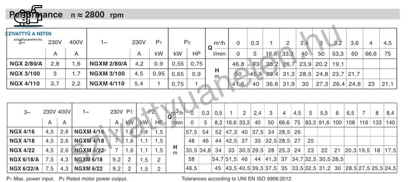 A Calpeda NGX önfelszívó jet rendszerű kerti szivattyú család kifejezetten lakossági felhasználásra készült, magas minőségű alapanyagok felhasználásával a tartósság, megbizhatóság jegyében. A Calpeda nem enged a minőségből! Ennek bizony ára van. Nem kíván az olcsó kerti szivattyúk sorába csatlakozni és a minőségéből engedni. AISI 304 rozsdamentes szívóházzal készül, motor tengelye pedig AISI 430 rozsdamentes acélból. Tengelytömítése, mely vízbehatolás ellen védi a motorteret karbon-kerámia-NBR kombináció, mely rendkívül jó kopásállóságú. A Calpeda NGXm 4/16 lapátkereke rézötvözetből, diffurzor-ejektor egysége PPO-GF20 norylból készülnek, melyek szintén kiváló minőségüek. Szívó oldali csatlakozása 5/4 coll, nyomóoldali csatlakozása 1 colos belső menet. Az egyfázisú 230V-os Calpeda NGXm 4/16 motorja 1100W-os és termikus hővédelemmel is rendelkezik. Motorja F szigeteléssel és IP 54 védelmi fokozattal rendelkezik. Maximum +35 fokos tiszta víz szivattyúzására alkalmas, a környezeti hőmérséklet maximuma pedig +40 fok. Maximális szívómélysége 9 méter. Nyomásfokozás esetén a szivattyúházban maximum 8 bar lehet! A Calpeda NGXm 4/16 kerti szivattyú maximális szállítókapacitása 75 liter/perc, mig függőleges nyomómagassága maximum 57,5 méter. Azaz maximum 5,75 bar nyomásra képes.