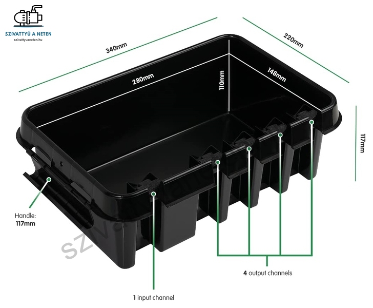 Belső méretek: 280 mm (H) x 148 mm (Szé) x 110 mm (Ma)