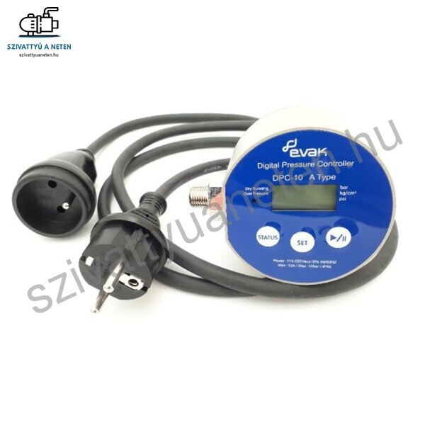 Digitális nyomáskapcsoló maximum 1500W-os szivattyúkhoz, szárazon futás elleni védelemmel. Evak DPC-10A IP 55 védettséggel kerti szivattyúkhoz, búvárszivattyúkhoz, centrifugál szivattyúkhoz, maximum 10 bar nyomásig, gyári tápkábellel.