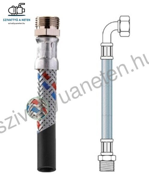 Flexibiliscső 1 colos külső-belső menetes hollanderes csatlakozással könyökös. Fixaflex inox 1 coll KB könyökös 500 mm flexicső maximum +90 fokig, 12 bar nyomásig.