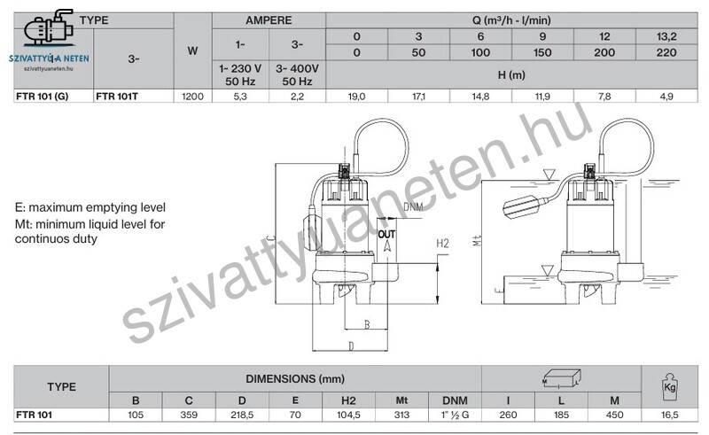 A Foras FTR 101 G vágókéses szennyvízszivattyú kifejezetten előnyös választás a lakossági fekáliás szennyvíz elvezetésére. Robosztus kialakítása, magas emelőmagassága, továbbá megbízhatósága teszi alkalmassá a feladatra. A Foras FTR 101 G rozsdamentes motor burkolattal és erős öntvény házzal rendelkezik. Az öntvényház alján található lábak szintén öntvényből készülnek, melyek megbízható, stabil állást biztosítanak a szennyvízszivattyú számára. A vágómű szerkezet rozsdamentes acélból készül, a fölötte beépítésre került járókerék, mely a felaprított szennyvizet továbbítja rézötvözetből készül. A Foras FTR 101 G szennyvízszivattyú kettős tengelytömítéssel rendelkezik, közbeiktatott olajkamrával. A szivattyú oldalon szilícium-karbid tömítés, a motor oldalon pedig kerámia-grafit tömítés található. A szennyvízszivattyú tengelye AISI 430 rozsdamentes acél. A Foras FTR 101 G szennyvízszivattyút maximum + 40 fokos folyadékhőmérsékletig szabad használni, továbbá maximum 5 méterre meríthető a szennyvízbe. A gyári 10 méteres elektromos vezetéknek és az úszókapcsolónak köszönhetően egyszerűen telepíthető, beüzemelhető. A 230V-os egyfázisú motor F szigeteléssel, réz tekercseléssel és IP 68 védettséggel rendelkezik. Nyomócsonkja függőleges kialakítású belső menetes, 6/4 colos.