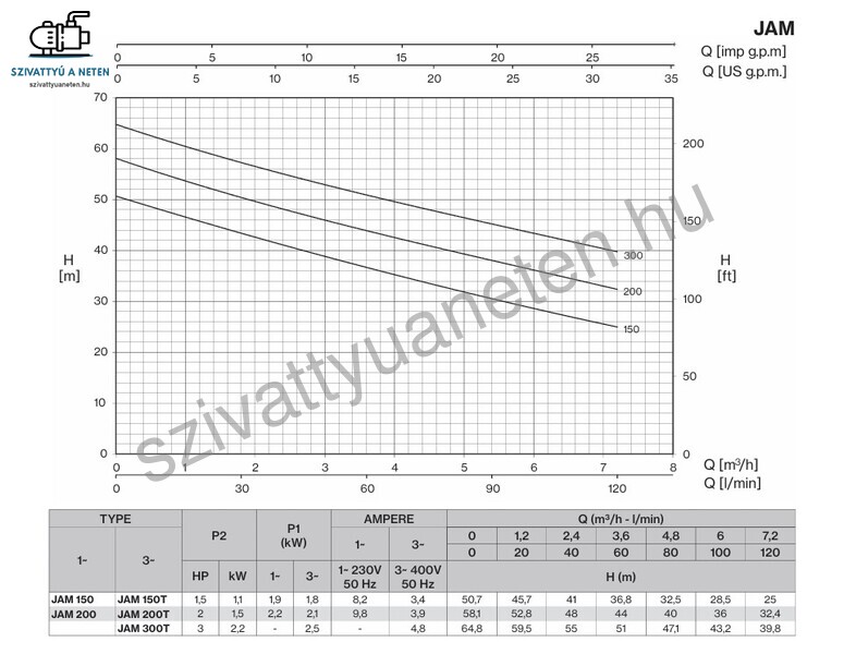 A Foras JAM 300/1T kerti szivattyú kifejezetten a lakossági felhasználásra öntözésre, vízellátási feladatok elvégzésére tervezett szivattyú. A kiváló minőségű alapanyagoknak köszönhetően tartós és megbízható kerti szivattyú. A szivattyú ház öntvényből készül, a mögötte található motortartó szintén öntvényből. A diffurzor ejektor egység a szivattyúházban technopolimerből, a járókerék pedig bronzból készül. A motortér védelméről vízbehatolás ellen jó kopásállóságú kerámia-grafit tengelytömítés gondoskodik, mely természetesen cserélhető. A Foras JAM 300/1T motortengelye kiváló minőségű AISI 416 rozsdamentes acél, tartós és erős. A maximális folyadékhőmérséklet amit ezzel az önfelszívó kerti szivattyúval szivattyúzni lehet + 50 fok. A Foras JAM 300/1T kerti szivattyú használható akár nyomásfokozásra is, de ez esetben figyelembe kell venni, hogy a szivattyúházban megengedett maximális nyomás értéke nem haladhatja meg a 8 bar nyomást. A Foras JAM 300/1T kerti szivattyú kétpólusú indukciós motorja F szigetelésű, réz tekercseléssel készül, IP 44 védettséggel.