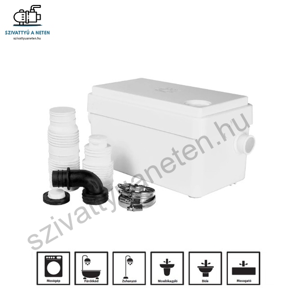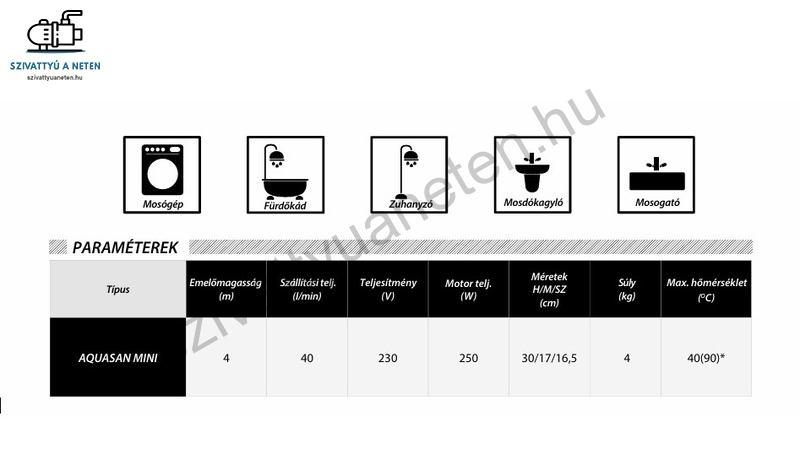 Az IBO AQUASAN MINI átemelő szivattyú telep elsősorban fürdőszobához, konyhához használatos berendezés. Különösen alagsorban, szuterén helyiségekben. A szivattyú hasonló felépítésű, mint a Sanibo mini szivattyúállomás, a kapcsolónak köszönhetően egy teljesen automatikus eszköz, amelyet a fürdőszobákban arra használnak, hogy a mosdóból, zuhanykabinból vagy a konyhába felszerelt mosógépekből vagy mosógatógépből történő víz elvezetését biztosítsa. Ideális fürdőszobákhoz, ahol a mosogató vagy zuhanytálca a szennyvízszivattyún kívül vagy az épületből származó szennyvízcsatorna alatt helyezkedik el. A szivattyú telep csatlakozhat többek között fürdőkád, zuhanyozófülke, mosógép, mosdókagyló, mosogató medence stb. A készülék kicsi mérete és a csendes működése lehetővé teszi a szivattyú diszkrét működését és így például a mosogató alatti szekrénybe is elhelyezhető.