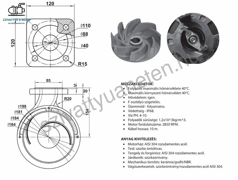 Tengely és forgórész: AISI 304 rozsdamentes acél