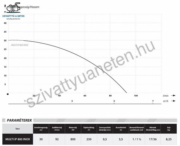 IBO Multi IP 800 Inox ásottkút szivattyú ideális választás a sekély mélységű gyűrűskutakhoz, az alkalomszerű öntözési feladatok ellátására. A szivattyú rozsdamentes acél házzal és többfokozatú hidraulikával, valamint gyári 10 méteres elektromos kábellel és úszókapcsolóval rendelkezik. A motor tekercsben hővédelem is beépítésre került. Maximum + 35 fokos tiszta víz szivattyúzható az IBO IP MULTI 800 Inox ásottkút szivattyúval és homoktűrő képessége 50 g/m3. B osztályú motor szigeteléssel és IP68 védettséggel rendelkezik.