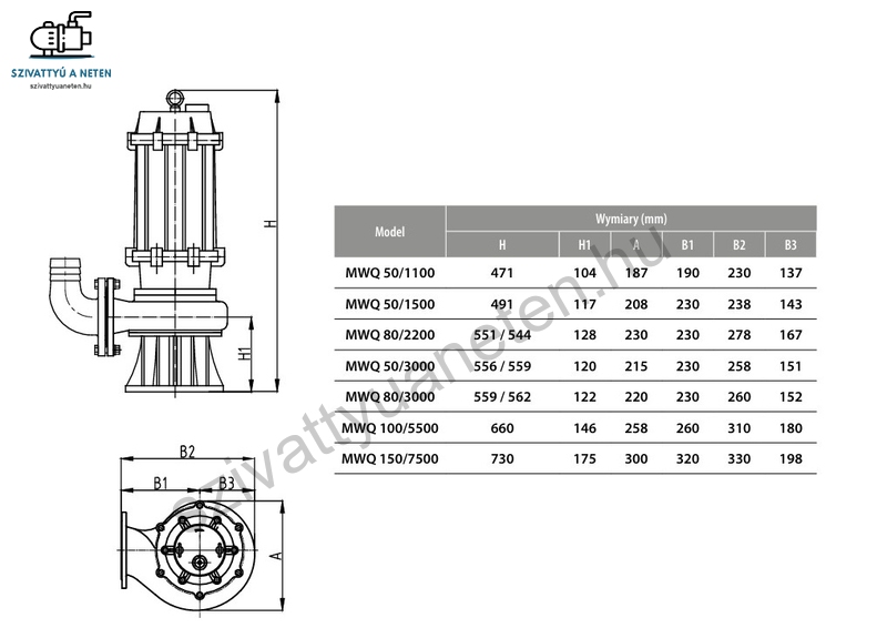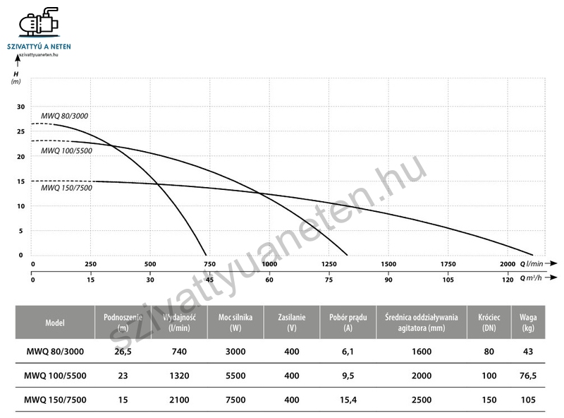 Professzionális IBO MWQ 100-5500-400 szennyvízszivattyú keverőrendszerrel, olyan ügyfelek számára, akiknek professzionális munkájuk során erős és megbízható termékre van szükségük. Ezeket a szivattyúkat széles körben használják szennyvízre, szivattyútelepeken. Az IBO MWQ szivattyúk nyers szennyvíz szivattyúzására szolgálnak olyan szivattyútelepekről, ahol sűrű iszap rakódhat le. A szivattyúk speciális kiegészítő külső rotorral (keverővel) rendelkeznek a nehéz iszap keverésére és felosztására. A felhasznált anyagok garantálják a hosszú távú és hibátlan működést. A motortengely anyaga rozsdamentes acél. A motorkamra kettős SiC/SiC mechanikus tömítéssel rendelkezik. A szivattyú többcsatornás járókereket használ a nagy átmérőjű szennyeződések szivattyúzására. Minden IBO MWQ szivattyú alkalmas vezetősín rendszerrel történő beépítésre. A motorok F osztályú tekercsszigeteléssel rendelkeznek, az egyfázisú változatok pedig a tekercsbe szerelt hővédelemmel is fel vannak szerelve. A szivattyúk a japán NSK által gyártott csapágyakkal rendelkeznek. Karimák a csövek csatlakoztatásához vagy gyorscsatlakozáshoz. A szivattyúk egyfázisú 230V ~/50Hz változatban és 3 fázisú 400V ~ 3/50Hz változatban is elérhetőek. A szivattyúk vezetősín rendszerekkel szállíthatók szivattyúállomásokba való beépítéshez. A vezetősín rendszer külön vásárolható meg.