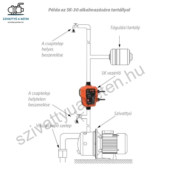 A szivattyú bekapcsol, amikor a rendszer nyomása egy előre beállított szint alá csökken, és a vízáramlás megindul. Amikor a vízvétel megszűnik, a vezérlő automatikusan leállítja a szivattyút. A beépített szárazonfutás elleni védelem megakadályozza a szivattyú meghibásodását, ha elfogy a víz.