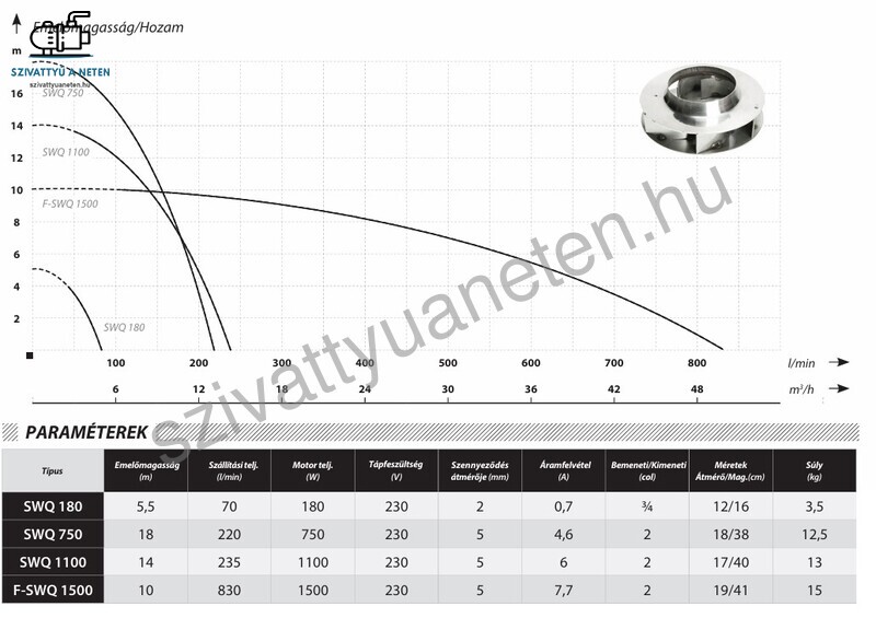 Az IBO SWQ 180 merülő vízmentesítő szivattyú úszókapcsoló nélküli modell és tiszta víz szivattyúzására használható, maximum 2 mm-es szennyeződéssel. Kiváló minőségű rozsdamentes acél szivattyúházzal rendelkezik, mely hosszútávú és megbízható működést biztosít. Az IBO SWQ 180 kis teljesítményű mindössze 180W-os motorral rendelkezik, maximális szállítókapacitása 70 liter/perc, és maximális függőleges emelési magassága 5,5 méter. A motor B szigetelési osztállyal és IP68 védettséggel rendelkezik, és a tekercsben hővédelem is beépítésre került. Mivel az IBO SWQ 180 köpenyhűtéses kialakítással rendelkezik ezért már alacsony vízállás mellett is üzembiztosan használható, megbízható zsomszivattyú. Az IBO SWQ 180 a legkissebb átmérővel rendelkező merülő vízmentesítő szivattyúnk! Átmérője mindössze 12 cm.