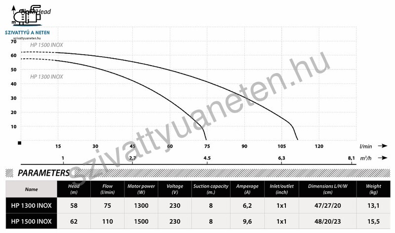 Ibo HP 1500 Inox többlépcsős önfelszívó felszíni kerti szivattyú, vízellátáshoz, nyomásfokozáshoz egyaránt használható. Ezt a típust, saját forrásból származó, tiszta víz szivattyúzására tervezték. A szivattyúház AISI 304 rozsdamentes acélból készül, a motor pedig hővédelemmel van ellátva. A szivattyú dugvillával ellátott tápkábellel van felszerelve. Ideális a kis és közepes mélységű házi kutakból való szivattyúzáshoz, kerti öntözéshez, kisebb nyomásfokozó feladatok ellátására. Szívó oldali csatlakozása 1 coll és nyomó oldali csatlakozása 1 colos belső menettel. Magas levegőtartalmú, gázos víz szivattyúzására is alkalmas kerti szivattyú.