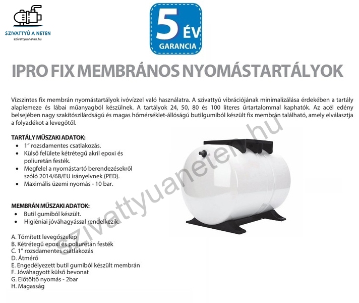 Prémium minőség, 5 év garancia, fix membrános hidrofor tartály. IPRO 100L fekvő hidrofor tartály a szivattyuaneten.hu -tól biztos kézből.