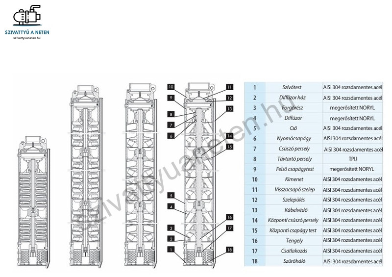 Többfokozatú búvárszivattyú 99 mm-es átmérővel, fokozott homokkal szembeni ellenállósággal. Az IPRO 4 COLL 16/030T búvárszivattyú csőkút szivattyú minimum 110 mm-es belső átmérővel rendelkező fúrt kútban használható. A megnövekedett homoktűrő képességet a lebegő járókerekek biztosítják, melyek kopásálló anyagokból készülnek, úgymint rozsdamentes acél és erősített műanyag. A maximális homoktartalom a vízben legfeljebb 5 %, azaz körülbelül 500 g/m3. Olajhűtéses, újra tekercselhető motorokkal készül, melynek maximum 150 méter bemerülés engedélyezett. A kiváló ár-érték aránnyal kapható IPRO 4 Coll 16/030T gyári 1 méter hosszúságú tápkábellel, melynek hosszabbítását igény esetén szakszerűen elkészítjük. Ügyfélszolgálatunkon érdeklődhet.