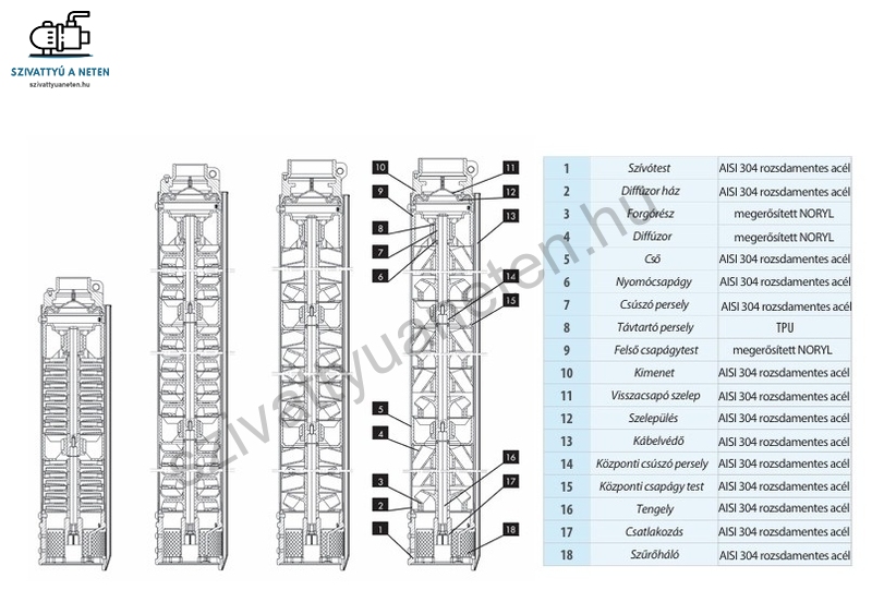 Többfokozatú búvárszivattyú 99 mm-es átmérővel, fokozott homokkal szembeni ellenállósággal. Az IPRO 4 COLL 16/055T búvárszivattyú csőkút szivattyú minimum 110 mm-es belső átmérővel rendelkező fúrt kútban használható. A megnövekedett homoktűrő képességet a lebegő járókerekek biztosítják, melyek kopásálló anyagokból készülnek, úgymint rozsdamentes acél és erősített műanyag. A maximális homoktartalom a vízben legfeljebb 5 %, azaz körülbelül 500 g/m3. Olajhűtéses, újra tekercselhető motorokkal készül, melynek maximum 150 méter bemerülés engedélyezett. A kiváló ár-érték aránnyal kapható IPRO 4 Coll 16/055T gyári 1 méter hosszúságú tápkábellel, melynek hosszabbítását igény esetén szakszerűen elkészítjük. Ügyfélszolgálatunkon érdeklődhet.