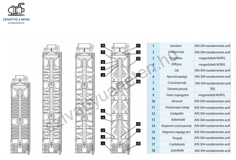 Többfokozatú búvárszivattyú 99 mm-es átmérővel, fokozott homokkal szembeni ellenállósággal. Az IPRO 4 COLL 8/040T búvárszivattyú csőkút szivattyú minimum 110 mm-es belső átmérővel rendelkező fúrt kútban használható. A megnövekedett homoktűrő képességet a lebegő járókerekek biztosítják, melyek kopásálló anyagokból készülnek, úgymint rozsdamentes acél és erősített műanyag. A maximális homoktartalom a vízben legfeljebb 5 %, azaz körülbelül 500 g/m3. Olajhűtéses, újra tekercselhető motorokkal készül, melynek maximum 150 méter bemerülés engedélyezett. A kiváló ár-érték aránnyal kapható IPRO 4 Coll 8/040T gyári 1 méter hosszúságú tápkábellel, melynek hosszabbítását igény esetén szakszerűen elkészítjük. Ügyfélszolgálatunkon érdeklődhet.