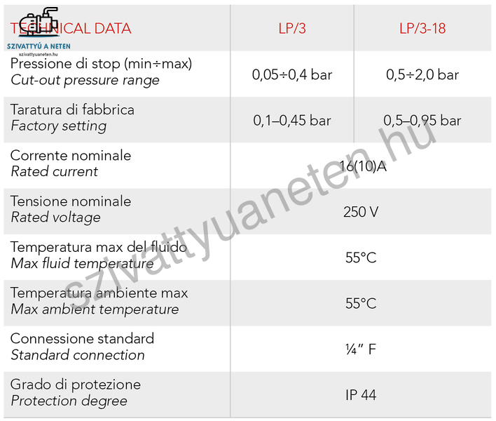 Az LP-3/18 kapcsolót a megfelelő működés érdekében sorba kell kötni elektromosan a hagyományos nyomáskapcsolóval.