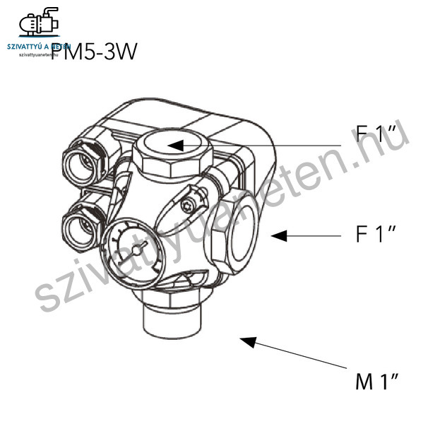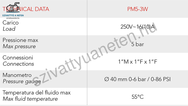 Az Italtecnica PM5-3W mechanikus nyomáskapcsoló ideális választás a kisebb méretű házivízellátó rendszerekhez, melyek hidrofor tartállyal üzemelnek. A három 1 colos csatlakozás, melyből egy darab külsőmenetes, és két darab belsőmenetes gyors és egyszerű összeépítést garantál, mellyel lényegesen csökkenthető a beépített alkatrészek száma és a költségek is.