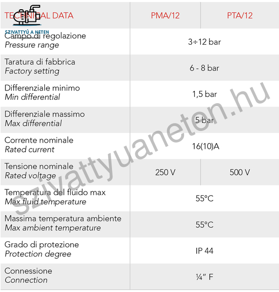 Az eredeti Italtecnica PMA-12 nyomáskapcsoló. Hagyományos és hozzáférhető megoldás levőgős rendszerek, kompresszorok kezelésére. A felhasznált anyagok kiváló minősége, különös tekintettel a biztonsági szempontokra, az elektromos kompresszorok gyártói által világszerte leggyakrabban használt nyomáskapcsolóvá tették.