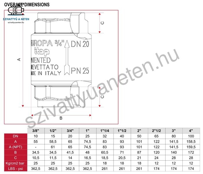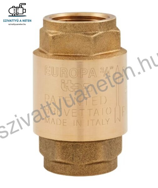 ITAP EUROPA visszacsapószelepek egyirányúak. Ez azt jelenti, hogy csak egy irányba engedik át a folyadékot, ezért szerelje fel úgy, hogy a testen lévő nyíl ugyanabban az irányban legyen, mint a folyadék áramlása. Az Itap Europa 2 coll visszacsapószelep teste, háza CW167N és tengelye CW614N bronzból készül. A belsejében található rugó és és alátét AISI 302 rozsdamentes acélból készül. A visszacsapószelep tányérja szintén CW614N bronzból. Az alátét és a tányér között található szelep gumi tartós és erős NBR. Az Itap Europa 2 coll visszacsapószelep bármilyen pozícióban felszerelhető, belsőmenetes csatlakozásokkal rendelkezik. Nyomástűrése 18 bar. Felhasználható vízellátó rendszerek, fűtési, légkondicionáló berendezések, légkompresszorok esetében. Működési hőmérséklet tartomány: -20- +100°C