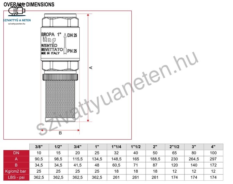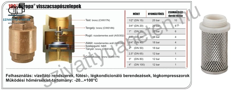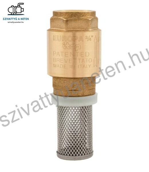 ITAP EUROPA lábszelepek egyirányúak. Ez azt jelenti, hogy csak egy irányba engedik át a folyadékot, ezért szerelje fel úgy, hogy a testen lévő nyíl ugyanabban az irányban legyen, mint a folyadék áramlása. Az Itap Europa 6/4 coll lábszelep teste, háza CW617N és tengelye CW614N bronzból készül. A belsejében található rugó és és alátét AISI 302 rozsdamentes acélból készül. A lábszelep tányérja szintén CW614N bronzból. Az alátét és a tányér között található szelep gumi tartós és erős NBR. Az Itap Europa 6/4 coll lábszelep bármilyen pozícióban felszerelhető, belsőmenetes csatlakozással rendelkezik. A szűrőkosár menetes csatlakozása polimerből, maga a szűrőkosár felület pedig AISI 304 rozsdamentes acélból készül. Ez a szűrőkosár egyszerűen letekerhető és ez esetben visszacsapószelepként is használhatjuk. Nyomástűrése 18 bar. Felhasználható vízellátó rendszerek, fűtési, légkondicionáló berendezések, esetében. Működési hőmérséklet tartomány: -20- +100°C