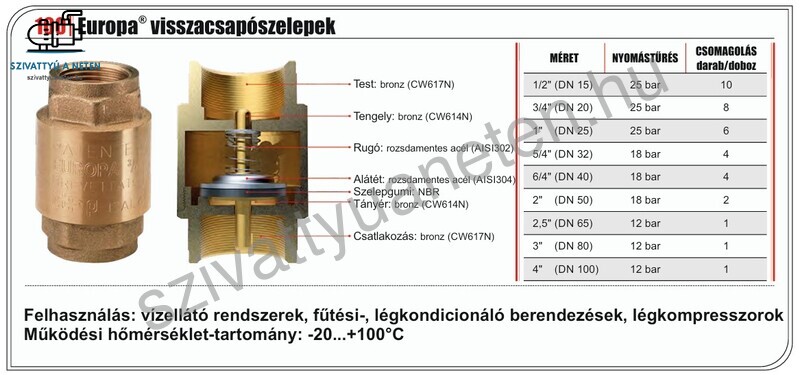 ITAP EUROPA visszacsapószelepek egyirányúak. Ez azt jelenti, hogy csak egy irányba engedik át a folyadékot, ezért szerelje fel úgy, hogy a testen lévő nyíl ugyanabban az irányban legyen, mint a folyadék áramlása. Az Itap Europa 6/4 coll visszacsapószelep teste, háza CW617N és tengelye CW614N bronzból készül. A belsejében található rugó és és alátét AISI 302 rozsdamentes acélból készül. A visszacsapószelep tányérja szintén CW614N bronzból. Az alátét és a tányér között található szelep gumi tartós és erős NBR. Az Itap Europa 6/4 coll visszacsapószelep bármilyen pozícióban felszerelhető, belsőmenetes csatlakozásokkal rendelkezik. Nyomástűrése 18 bar. Felhasználható vízellátó rendszerek, fűtési, légkondicionáló berendezések, légkompresszorok esetében. Működési hőmérséklet tartomány: -20- +100°C