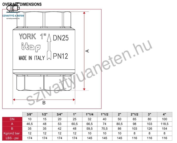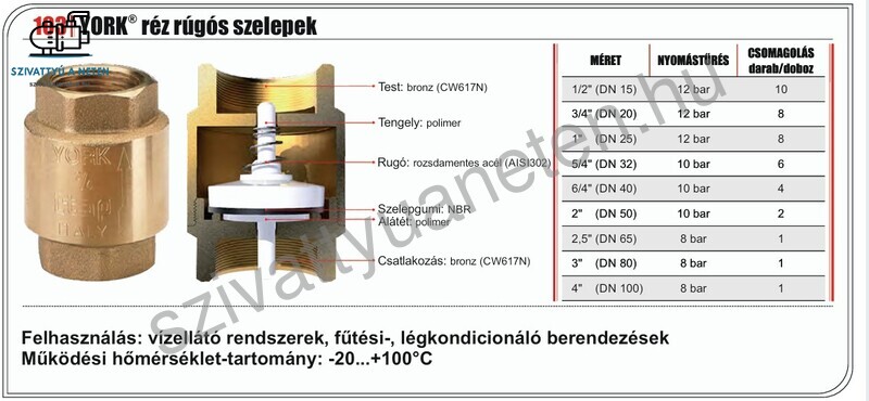 ITAP York visszacsapószelepek egyirányúak. Ez azt jelenti, hogy csak egy irányba engedik át a folyadékot, ezért szerelje fel úgy, hogy a testen lévő nyíl ugyanabban az irányban legyen, mint a folyadék áramlása. Az Itap York 2 coll visszacsapószelep teste, háza CW617N bronzból készül. A belsejében található rugó AISI 302 rozsdamentes acélból készül. A York visszacsapószelep tengelye és tányárja, valamint alátétje erős polimerből készül, a tányér alatti tömítés pedig NBR. Az Itap York 2 coll visszacsapószelep bármilyen pozícióban felszerelhető, belsőmenetes csatlakozással rendelkezik. Nyomástűrése 10 bar. Felhasználható vízellátó rendszerek, fűtési, légkondicionáló berendezések, esetében. Működési hőmérséklet tartomány: -20- +100°C