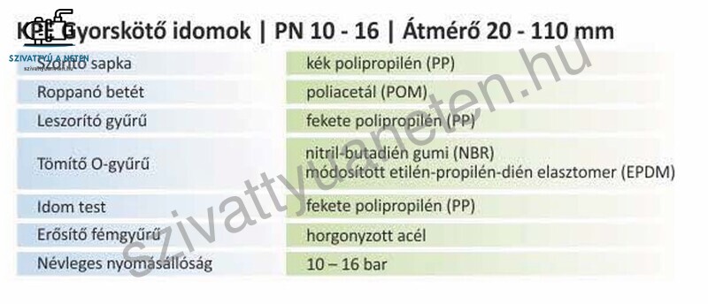 A KPE gyorskötő idomok kifejezetten a polietilén (PE) csövek csatlakozására lettek tervezve. Ezek a csatlakozók kompatibilisek az EN12201 szabványnak megfelelő PE80 és PE100 csövekkel. A termék lehetővé teszi a polietilén csövek gyors és biztonságos csatlakozását mind az iparban, mezőgazdaságban, vagy a házi felhasználás esetén is. Elérhető méretek webáruházunkban 25-32 mm átmérőig, maximális üzemi nyomás: 16 bar.