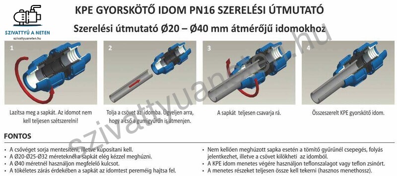 A KPE gyorskötő idomok kifejezetten a polietilén (PE) csövek csatlakozására lettek tervezve. Ezek a csatlakozók kompatibilisek az EN12201 szabványnak megfelelő PE80 és PE100 csövekkel. A termék lehetővé teszi a polietilén csövek gyors és biztonságos csatlakozását mind az iparban, mezőgazdaságban, vagy a házi felhasználás esetén is. Elérhető méretek webáruházunkban 25-32 mm átmérőig, maximális üzemi nyomás: 16 bar.