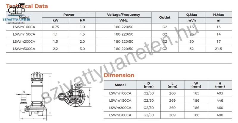 A Leo LSWm 150CA vágókéses darálós szennyvízszivattyú egyfázisú 230V-os motorral készül, úszókapcsolóval ellátva. Robosztus, erős felépítésének köszönhetően ideális a lakossági szennyvíz elvezetésére, fekáliás víz szivattyúzására. Ez a szivattyú szilárd testű és rostos részekkel rendelkező szennyvíz szivattyúzására és őrlésére, ülepítő gödrök, és szennyvízgyűjtő aknák ürítésére, valamint háztartási, ipari és mezőgazdasági felhasználásra szánt szennyvíz mozgatására használható. A Leo LSWm 150CA szennyvízszivattyúval maximum + 40 fokos szennyvíz szivattyúzható. A folyadék pH értéke 4-10 között lehetséges. Maximális meríthetősége 5 méter. Az egyfázisú 230V-os réz tekercselésű motor 1100W-os és termikus hővédelemmel is rendelkezik, és IP 68 védettségű. Rozsdamentes acél tengelye és vágókése, valamint öntvény járókereke biztosítják a hosszú élettartamot és megbízhatóságot. Elektromos kábele 10 méter hosszúságú. A Leo LSWm 150CA vágókéses darálós szennyvízszivattyú maximális függőleges emelési magassága 14 méter, a maximális szállító kapacitása pedig 25000 liter/óra. Nyomócsonkja 2 colos méretű. Ideális akár fix telepítésre is, automata üzemmódra.