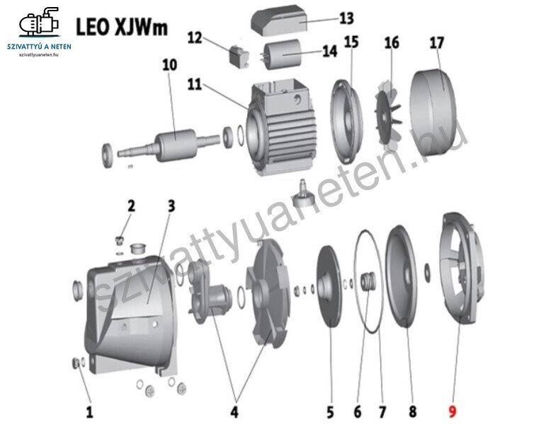 A termékképen látható (9) számú Leo XJWm 180/42 szivattyú alkatrész.