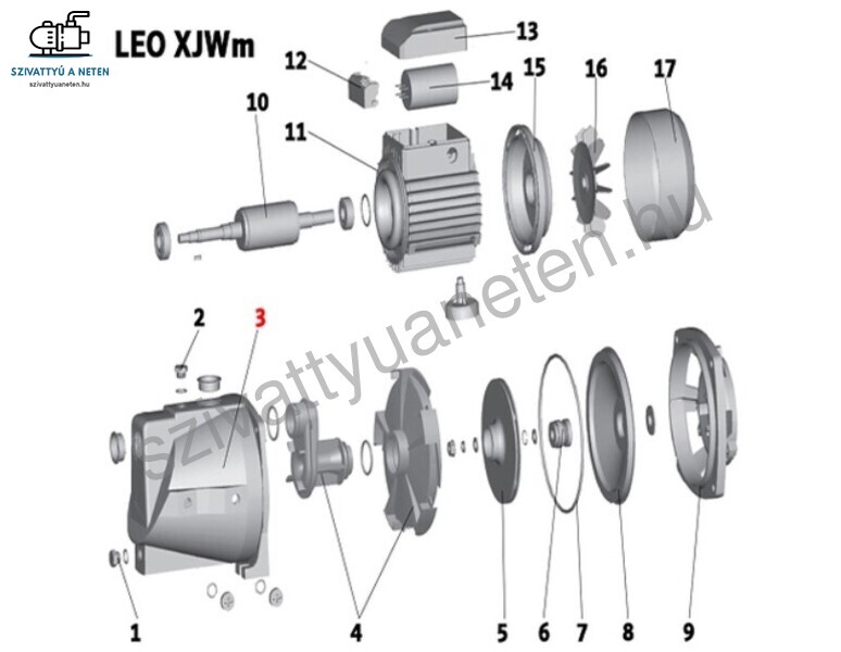 A termékképen látható (3) számú Leo XJWm 90/55 szivattyú alkatrész. Ez a Leo szivattyú alkatrész a 2015-től gyártott Leo XJWm 90/55 szivattyúhoz használható!
