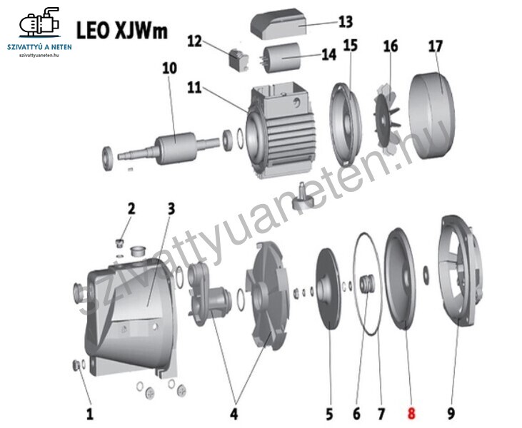 A termékképen látható (8) számú Leo XJWm 90/55 szivattyú alkatrész. Ez a Leo szivattyú alkatrész a 2015-től gyártott Leo XJWm 90/55 szivattyúhoz használható!