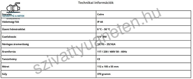 Általános mechanikus nyomáskapcsoló egyfázisú (PMP széria) szivattyúkhoz. Használatukkal a szivattyúmotorok indítása és leállítása automatizálható két beállított nyomásértéket elérve. Ajánlott házi vízművek felújítására, egyszerűbb háztartási szivattyús rendszerek vezérlésére, öntözési feladatok ellátására.