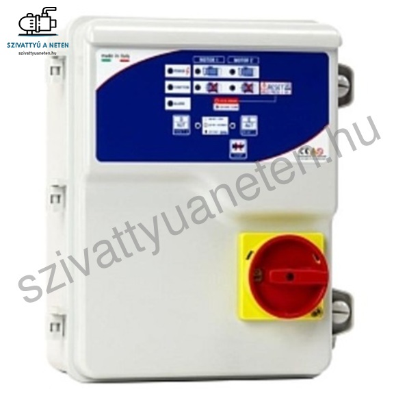 Közvetlen indítású elektronikus motorvédelem szivattyúkhoz, általános megszakító kapcsolóval és ajtózárral. Két szivattyús 230V-os motorvédelem, tiszta vagy szennyvízben történő szivattyú működtetésére.