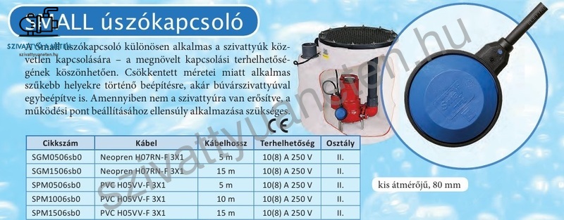 Úszókapcsoló 15 méteres neopren kábellel, ürítő, vagy töltő funkcióra használható, védőföldeléssel NEM rendelkezik. Alkalmas vízszivattyúkhoz és professzionális vízvezeték-rendszerek automatizálásához. Small kisméretű úszókapcsoló.