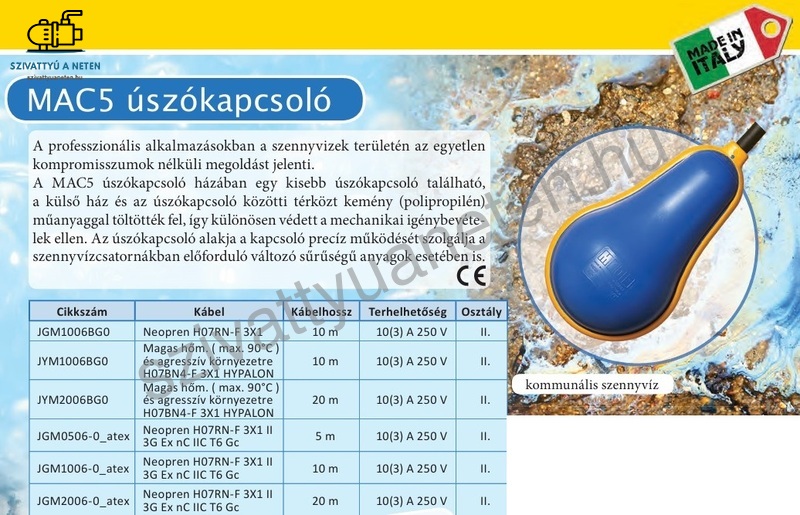 A MAC5 10M neopren billenős úszókapcsolókat szennyvizek szintszabályozására alkalmazzák. Akár elektromos vezérlőszekrényre, akár közvetlenül szivattyúra is köthető. A MAC5 úszókapcsoló alakjából adódóan kitűnően alkalmazható lakossági, és ipari szennyvíz, mezőgazdasági folyadékok, zavaros vizek szintszabályozásához. Ez a szennyvizes úszókapcsoló dupla vízzáró réteggel burkolt, beépített ellensúllyal kapható.