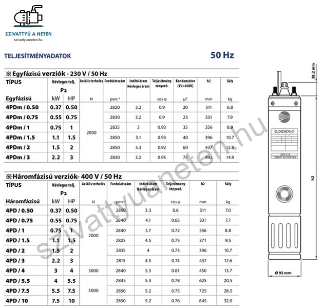 A Pedrollo 4PD/0,5 búvárszivattyú motor DUPLEX rozsdamentes acél tengellyel készül, külső burkolata pedig AISI 316 rozsdamentes acélból. A DUPLEX acél kivételes mechanikai szilárdságáról ismert, mely kétszerese az AISI 304/316L acélénak. A Pedrollo 4PD/0,5 2 méter hosszúságú gyári tápkábellel rendelkezik. Maximum + 40 fokos folyadékhőmérsékletig használható. A kiváló minőségű alapanyagok és tengelytömítéseknek köszönhetően ezek a búvárszivattyú motorok maximum 200 méterre meríthetőek a víz alá. Indítások száma/óra maximum 20, szabályos időközönként. A Pedrollo 4PD/0,5 a megfelelő működése érdekében 8cm/mp áramlási sebesség szükséges. Folyamatos üzemű S1 motor, mely F szigetelési osztállyal, valamint IP 68 védettséggel rendelkezik. A NEMA szabvány szerinti kialakításnak köszönhetően más márkájú motorokkal is kiváltható, melyek szintén NEMA szabvágy csatlakozásokkal készült.