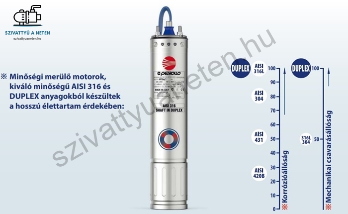 A Pedrollo 4PD/10 búvárszivattyú motor DUPLEX rozsdamentes acél tengellyel készül, külső burkolata pedig AISI 316 rozsdamentes acélból. A DUPLEX acél kivételes mechanikai szilárdságáról ismert, mely kétszerese az AISI 304/316L acélénak. A Pedrollo 4PD/10 3,6 méter hosszúságú gyári tápkábellel rendelkezik. Maximum + 40 fokos folyadékhőmérsékletig használható. A kiváló minőségű alapanyagok és tengelytömítéseknek köszönhetően ezek a búvárszivattyú motorok maximum 200 méterre meríthetőek a víz alá. Indítások száma/óra maximum 20, szabályos időközönként. A Pedrollo 4PD/10 a megfelelő működése érdekében 8cm/mp áramlási sebesség szükséges. Folyamatos üzemű S1 motor, mely F szigetelési osztállyal, valamint IP 68 védettséggel rendelkezik. A NEMA szabvány szerinti kialakításnak köszönhetően más márkájú motorokkal is kiváltható, melyek szintén NEMA szabvágy csatlakozásokkal készült.