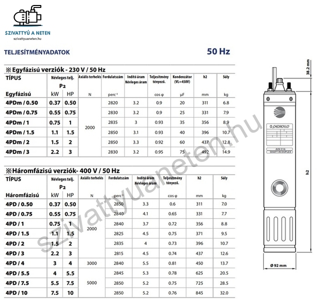 Pedrollo 4PD/10 4 colos búvárszivattyú motor gyors szállítással. Pedrollo 4PD/10 háromfázisú 7,5 KW-os búvárszivattyú motor kiváló minőségben.