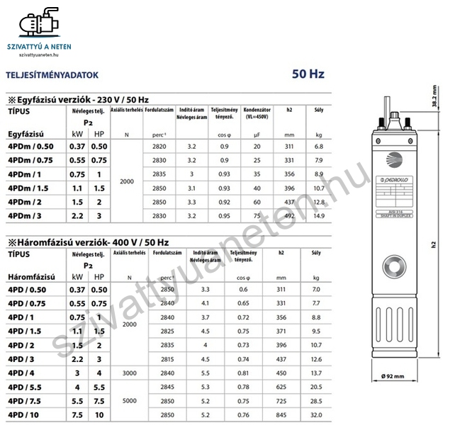 Pedrollo 4PD/1,5 4 colos búvárszivattyú motor gyors szállítással. Pedrollo 4PD/1,5 háromfázisú 1100W-os búvárszivattyú motor kiváló minőségben.