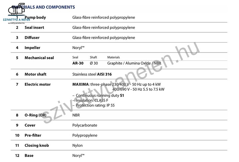 A Pedrollo Maxima-4 250 medence vízforgató szivattyú tartós, erős noryl járókerékkel készül, a motortengely pedig AISI 316 rozsdamentes acélból. Üvegszállal erősített polipropilén szívóházzal rendelkezik, mechanikus tömítése AISI 316 rozsdamentes acélból készül. Az előszűrő fedele pedig polikarbonátból. Az összeszereléshez AISI 304 rozsdamentes csavarok lettek felhasználva. A Pedrollo Maxima-4 250 medence szivattyú a legkorszerűbb IE3 motorokkal készül, természetesen réz tekercseléssel, F szigeteléssel. Védelmi besorolása: IP 55. Igény esetén ez a medence szivattyú rendelhető bronz járókerékkel is.