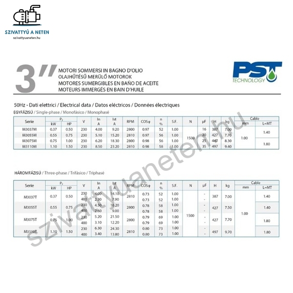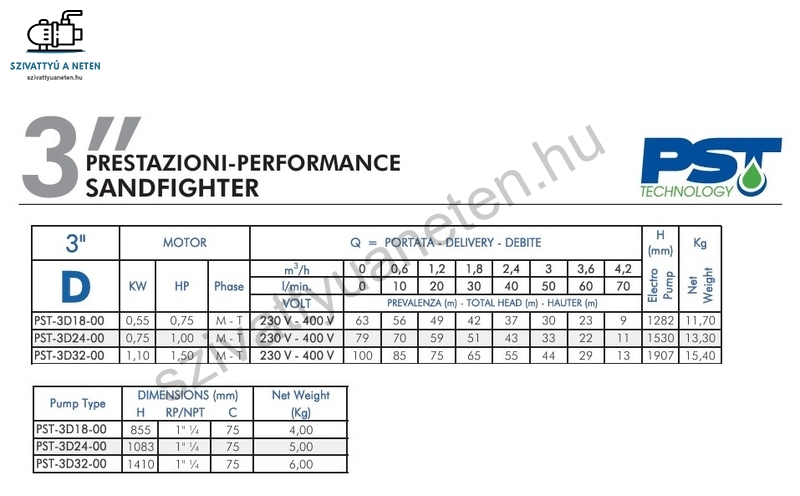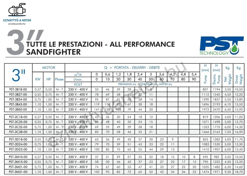 A 100% -ban Olaszországban készült PST Techology SANDFIGHTER 3D32-T búvárszivattyú minimum DN80 átmérőjű kútban használható. A kiemelkedő homoktűrő képességnek köszönhetően, akár 800 g/m3 homok jelenlétében is alkalmas a víz szivattyúzására. A PST búvárszivattyú magas minőségű anyagok felhasználásával készül (AISI 304 és AISI 316 rozsdamentes acél, homoktűrő technopolimer, sárgaréz kombinációval). A berendezések telepíthetőek függőlegesen és vízszintesen (18 járókerékig) is. A berendezések gyárilag beépített (igény szerint leszerelhető) visszacsapó szeleppel kerülnek kiszállításra, a tápkábel hossza 1,5m, melynek szakszerű hosszabbítására felár ellenében lehetőséget biztosítunk. A 400V-os PST búvárszivattyú megfelelő motorvédelméről ne felejtsen el megfelelően gondoskodni!