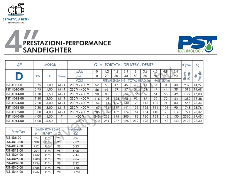 A 100% -ban Olaszországban készült PST Techology SANDFIGHTER 4D14 búvárszivattyú minimum DN110 átmérőjű kútban használható. A kiemelkedő homoktűrő képességnek köszönhetően, akár 800 g/m3 homok jelenlétében is alkalmas a víz szivattyúzására. A PST búvárszivattyú magas minőségű anyagok felhasználásával készül (AISI 304 és AISI 316 rozsdamentes acél, homoktűrő technopolimer, sárgaréz kombinációval). A berendezések telepíthetőek függőlegesen és vízszintesen (18 járókerékig) is. A berendezések gyárilag beépített (igény szerint leszerelhető) visszacsapó szeleppel kerülnek kiszállításra, a tápkábel hossza 1,5m, melynek szakszerű hosszabbítására felár ellenében lehetőséget biztosítunk. A 230V - os szivattyúk külső vezérlő doboza (kondenzátor, hőkioldó) nem alap tartozék. Ez külön megvásárolható webáruházunkban. Indítódobozok: ITT!