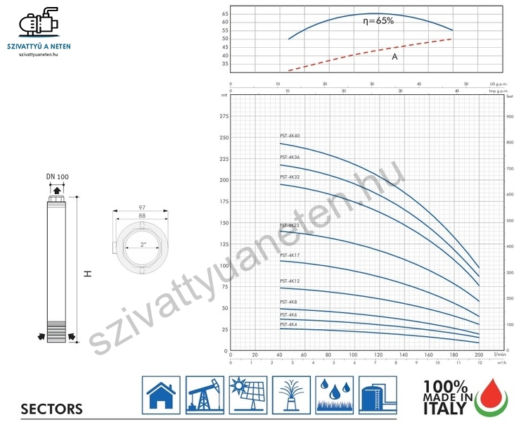 A 100% -ban Olaszországban készült PST Techology SANDFIGHTER 4K4-T búvárszivattyú minimum DN110 átmérőjű kútban használható. A kiemelkedő homoktűrő képességnek köszönhetően, akár 800 g/m3 homok jelenlétében is alkalmas a víz szivattyúzására. A PST búvárszivattyú magas minőségű anyagok felhasználásával készül (AISI 304 és AISI 316 rozsdamentes acél, homoktűrő technopolimer, sárgaréz kombinációval). A berendezések telepíthetőek függőlegesen és vízszintesen (18 járókerékig) is. A berendezések gyárilag beépített (igény szerint leszerelhető) visszacsapó szeleppel kerülnek kiszállításra, a tápkábel hossza 1,5m, melynek szakszerű hosszabbítására felár ellenében lehetőséget biztosítunk. A 400V-os PST búvárszivattyú megfelelő motorvédelméről ne felejtsen el megfelelően gondoskodni!